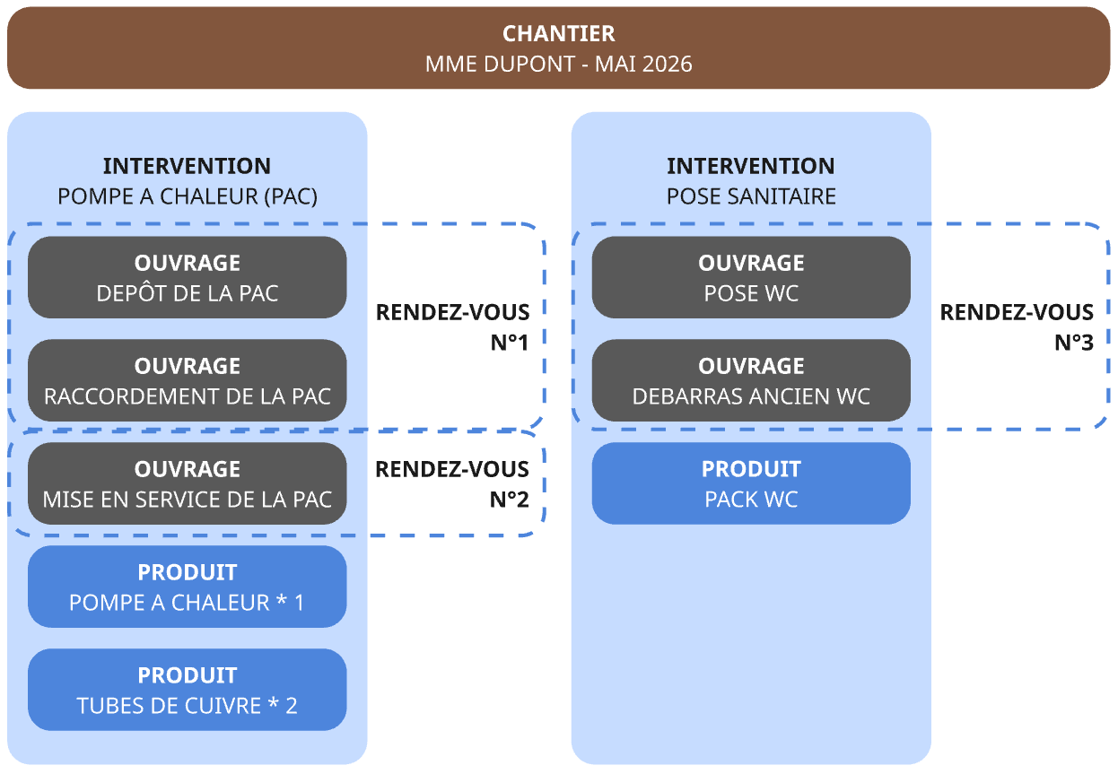 Le chantier définit un cadre pour la réalisation des interventions chez le client. Pendant ou après le chantier, l'entreprise peut établir un bilan de chantier regroupant tous les éléments financiers directement rattachés au chantier (produits fournis, temps des opérateurs, factures d'achat, etc.)