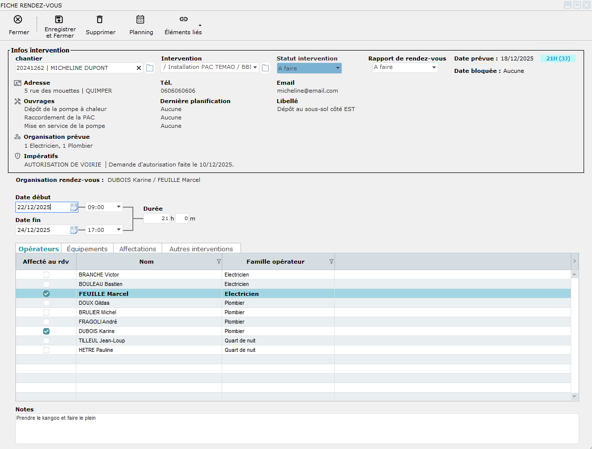 Nous souhaitons indiquer aux opérateurs de prendre le Kangoo pour leur intervention et de faire le plein. Nous ajoutons donc comme note de rendez-vous : "Prendre le Kangoo et faire le plein".