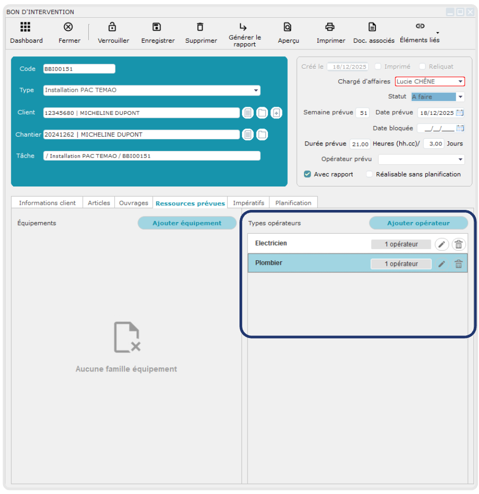 Nous avons donc indiqué dans notre bon les types d'opérateurs nécessaires à l'intervention :