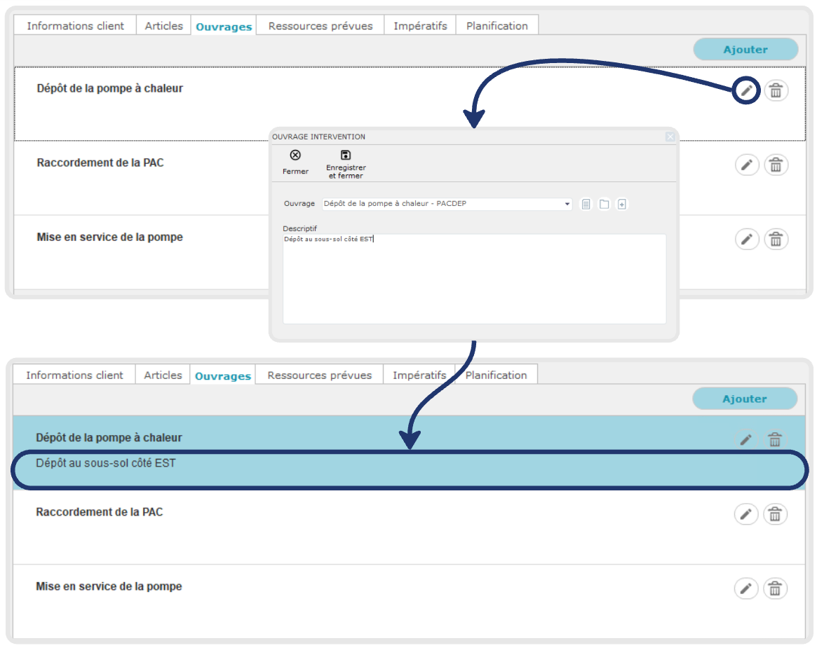On retrouve les ouvrages à réaliser dans l'onglet Ouvrages du bon. Ici nous souhaitons ajouter un commentaire au premier ouvrage pour détailler son contenu en cliquant sur l'icône