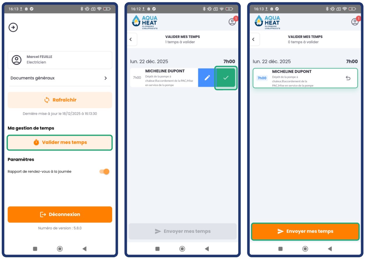 Ainsi, pour chaque journée, le rapport de rendez-vous doit être envoyé par la cheffe d'équipe et les temps saisis validés par chaque opérateur.