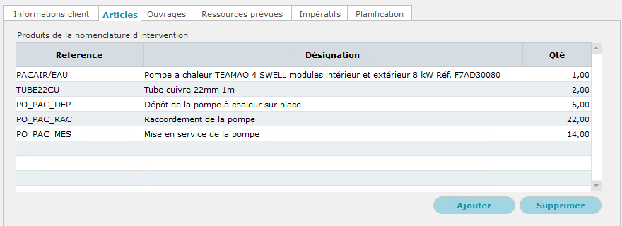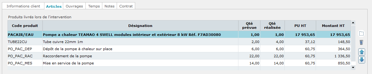 Dans la fiche du bon d'intervention, les articles et ouvrages sont automatiquement hérités de notre type d'intervention Installation PAC TEMAO.