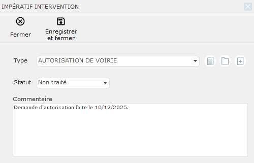 Pour ajouter un impératif, nous allons dans l'onglet Impératifs et cliquons sur Ajouter. Ici, nous sélectionnons l'impératif Autorisation de voirie et ajoutons un commentaire pour indiquer l'avancement de l'impératif.