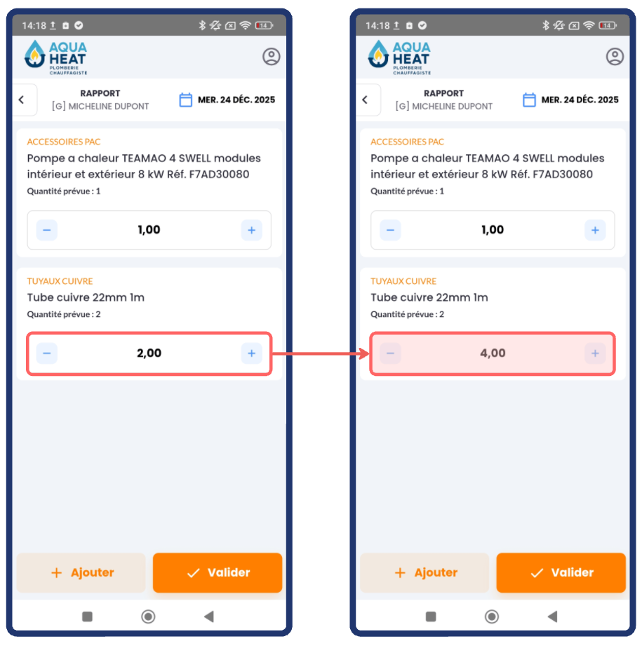Dans notre exemple, nous avons livré une Pompe à chaleur comme prévu, mais 4 Tuyaux de cuivre au lieu de 2. Nous ajustons les quantités fournies :