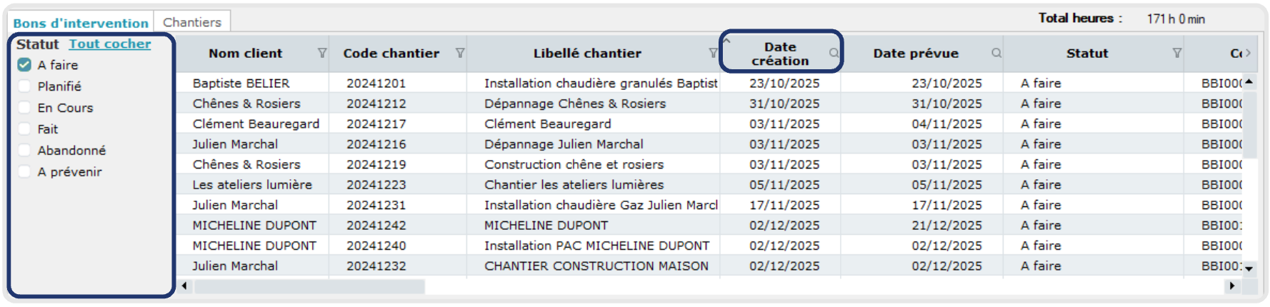 Cliquant sur l'entête de la colonne Date de création pour afficher les bons par date de création.