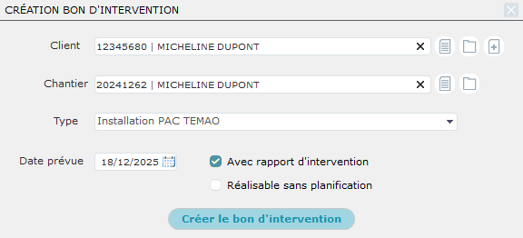 Par défaut, les cases Avec Rapport d'intervention et Réalisable sans planification sont cochées ou décochées selon leur paramétrage dans la Fiche du type d'intervention Installation PAC TEMAO, mais nous pouvons aussi les cocher / décocher ici sans impacter le paramétrage. Ici, nous laissons les coches par défaut du type d'installation.