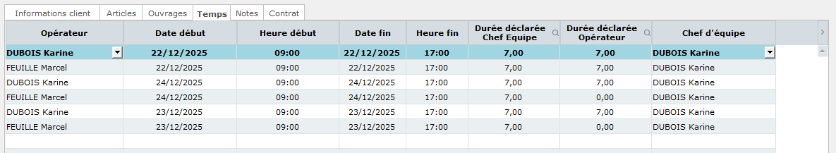 Dans l'onglet Opérateurs, nous sélectionnons Marcel FEUILLE puis nous allons dans l'onglet Affectations pour affecter un des deux opérateurs comme chef d'équipe. Par défaut, le premier opérateur affecté au rendez-vous est automatiquement affecté comme chef de chantier. Ici, on souhaite laisser Karine DUBOIS comme cheffe d'équipe.