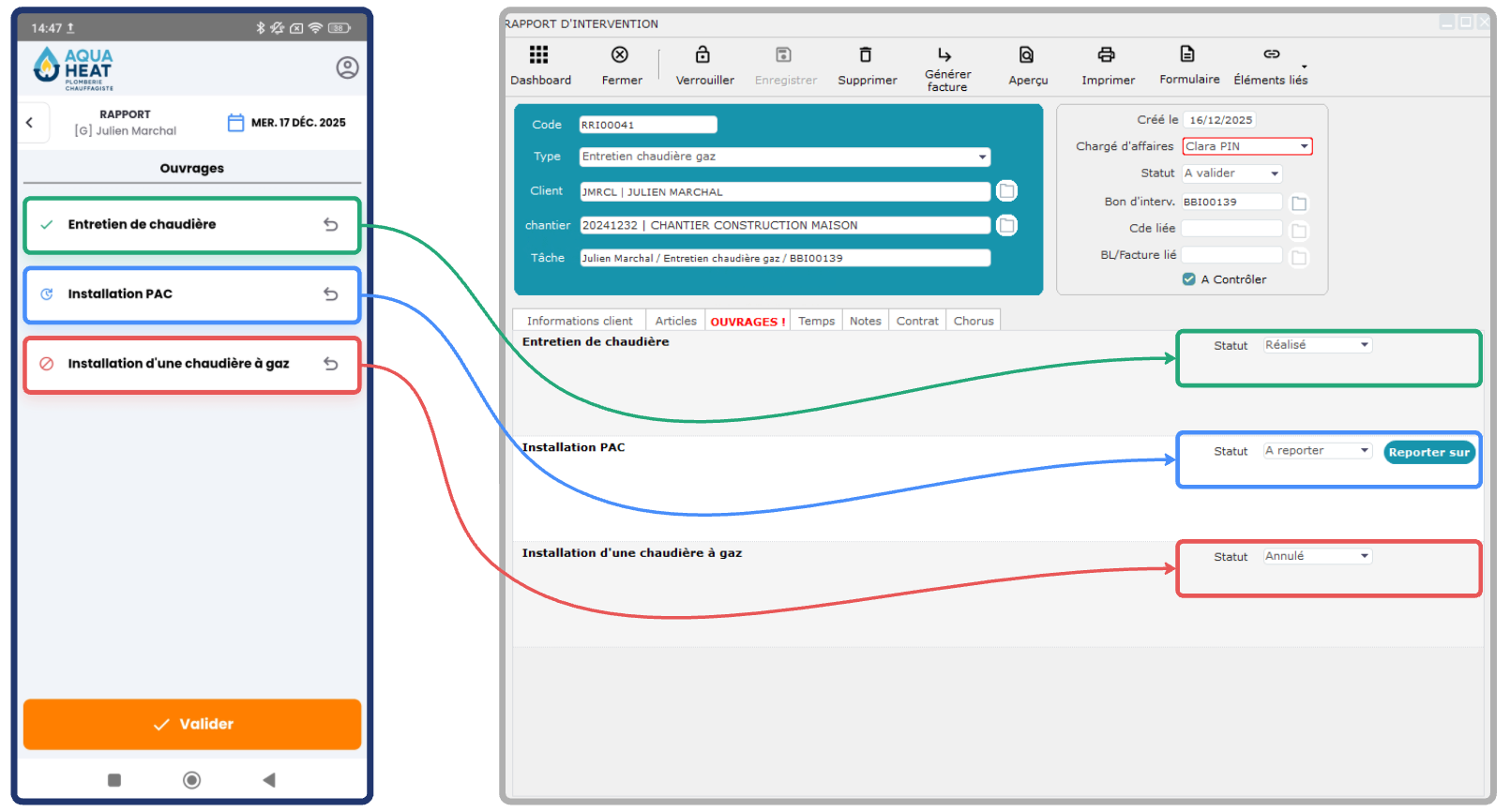 Une fois le rapport de rendez-vous ou d'intervention envoyé, le statut des ouvrages est automatiquement mis à jour dans le rapport d'intervention sur ATOOK Bureau (les statuts peuvent tout de même encore être modifiés dans ATOOK Bureau).