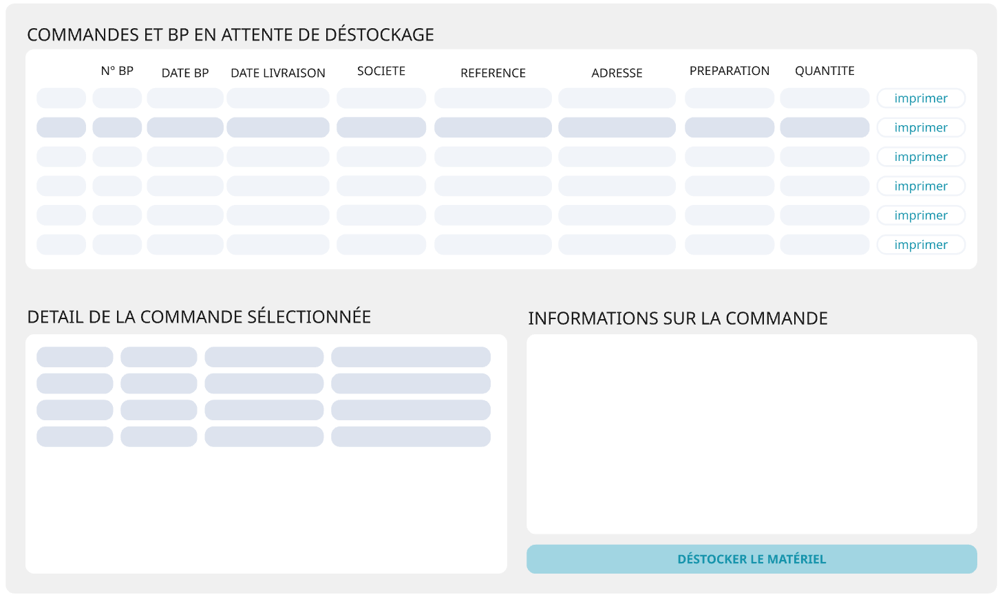 Le tableau du haut montre les commandes et BP en attente de déstockage.