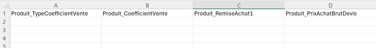 Pour l'import de nouveaux produits, le tableau Excel source doit impérativement contenir les colonnes Produit_Code (Code du produit) et Produit_RéférenceFournisseur (référence fournisseur du produit). Ces colonnes sont indispensables pour générer un code interne unique à ces produits.
