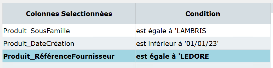 Toujours dans la fenêtre FICHE REQUETE, aller dans l'onglet Conditions Avancées pour filtrer les produits et extraire uniquement ceux qui correspondent à nos critères.