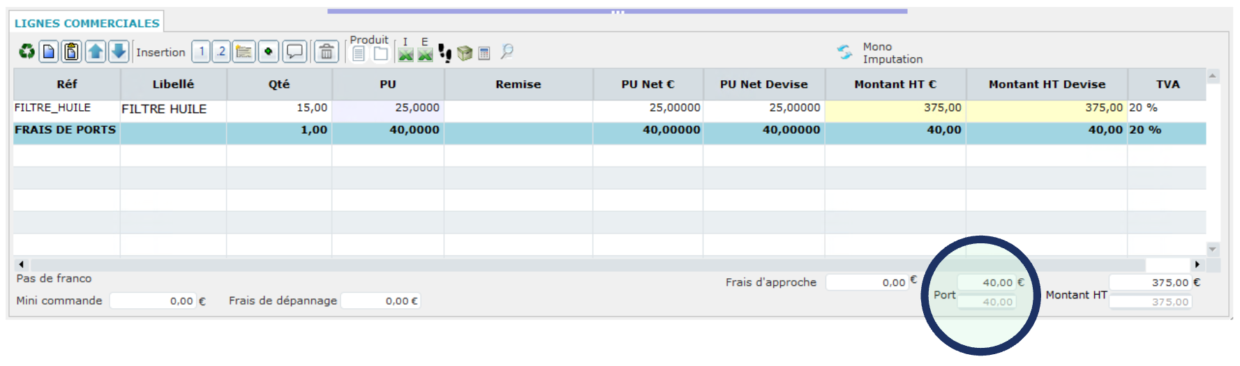 es frais de ports sont automatiquement identifiés comme tel et répercutés sur la pièce commerciale