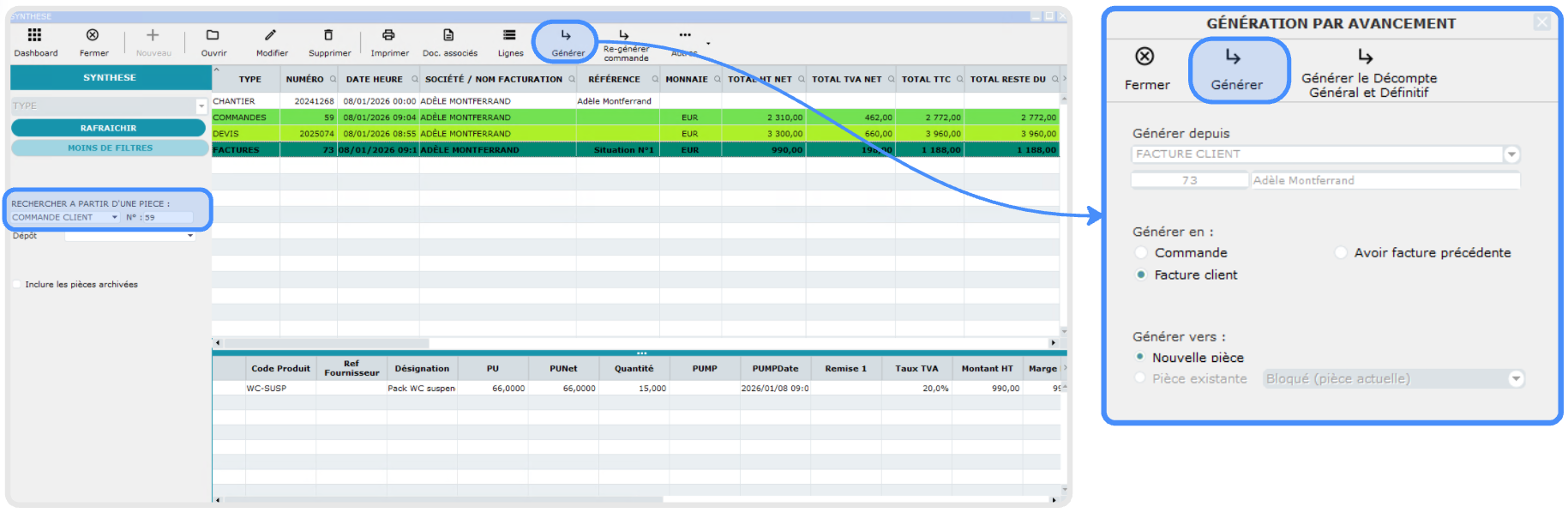 De retour dans la SYNTHESE, nous sélectionnons la commande et nous cliquons sur Générer.