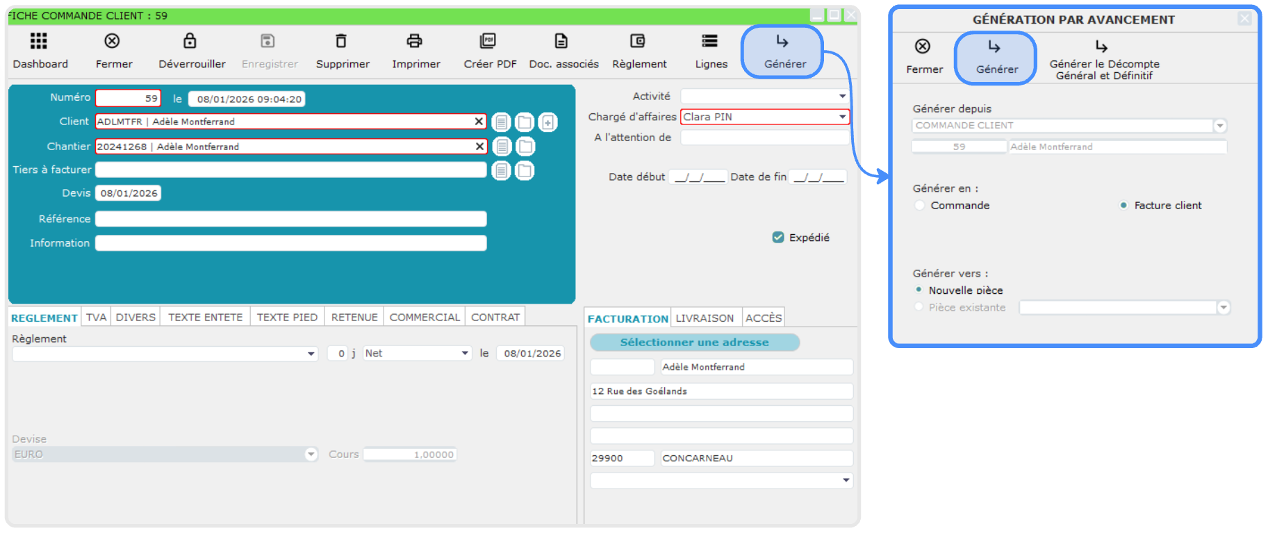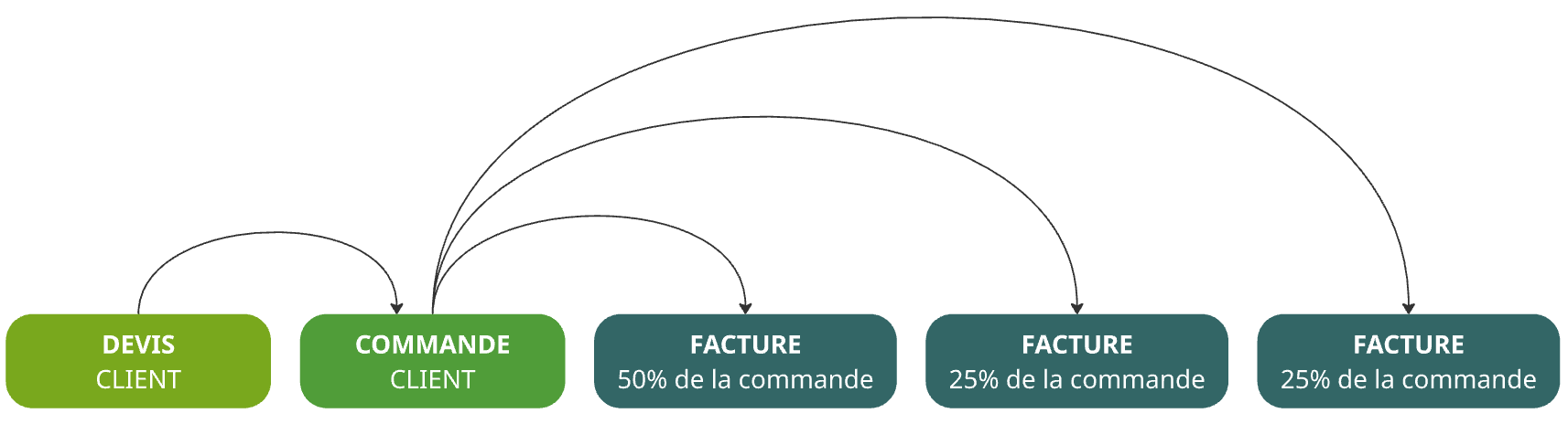 Générer une commande par avancement signifie que la commande sera générée en factures au fur et à mesure de l'avancement des travaux (ou de la livraison de la commande). Plusieurs factures seront générées depuis une seule commande.