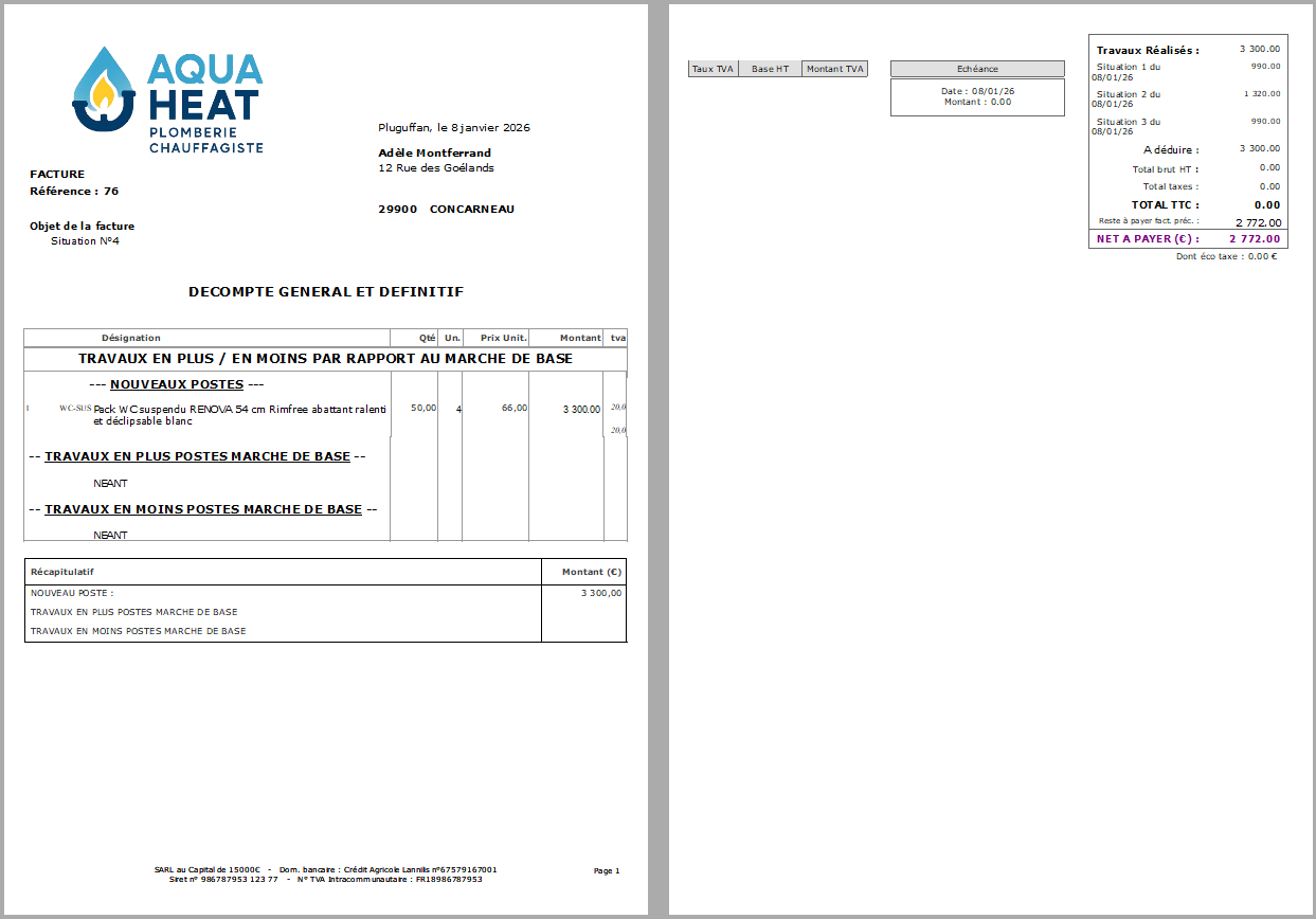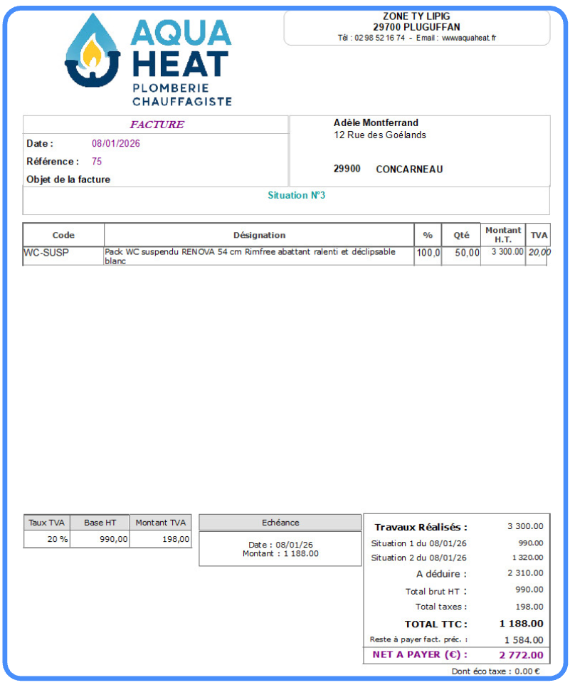 On obtient la facture de situation N°3 suivante, sur laquelle apparaît au bas de page le montant restant à payer au titre des factures précédentes, et le montant à payer au titre de la situation N°3 ainsi que le total des deux montants.
