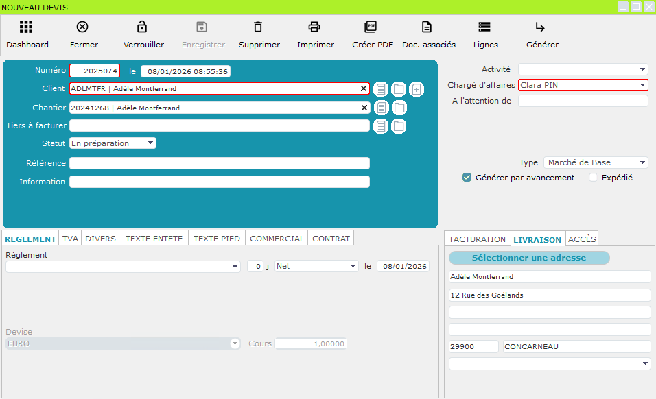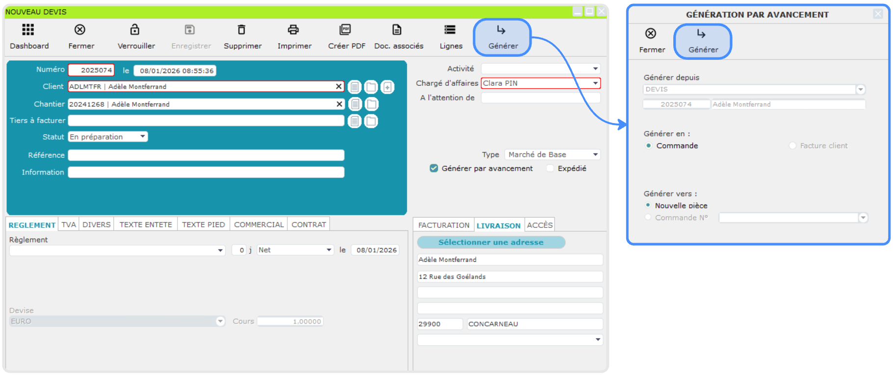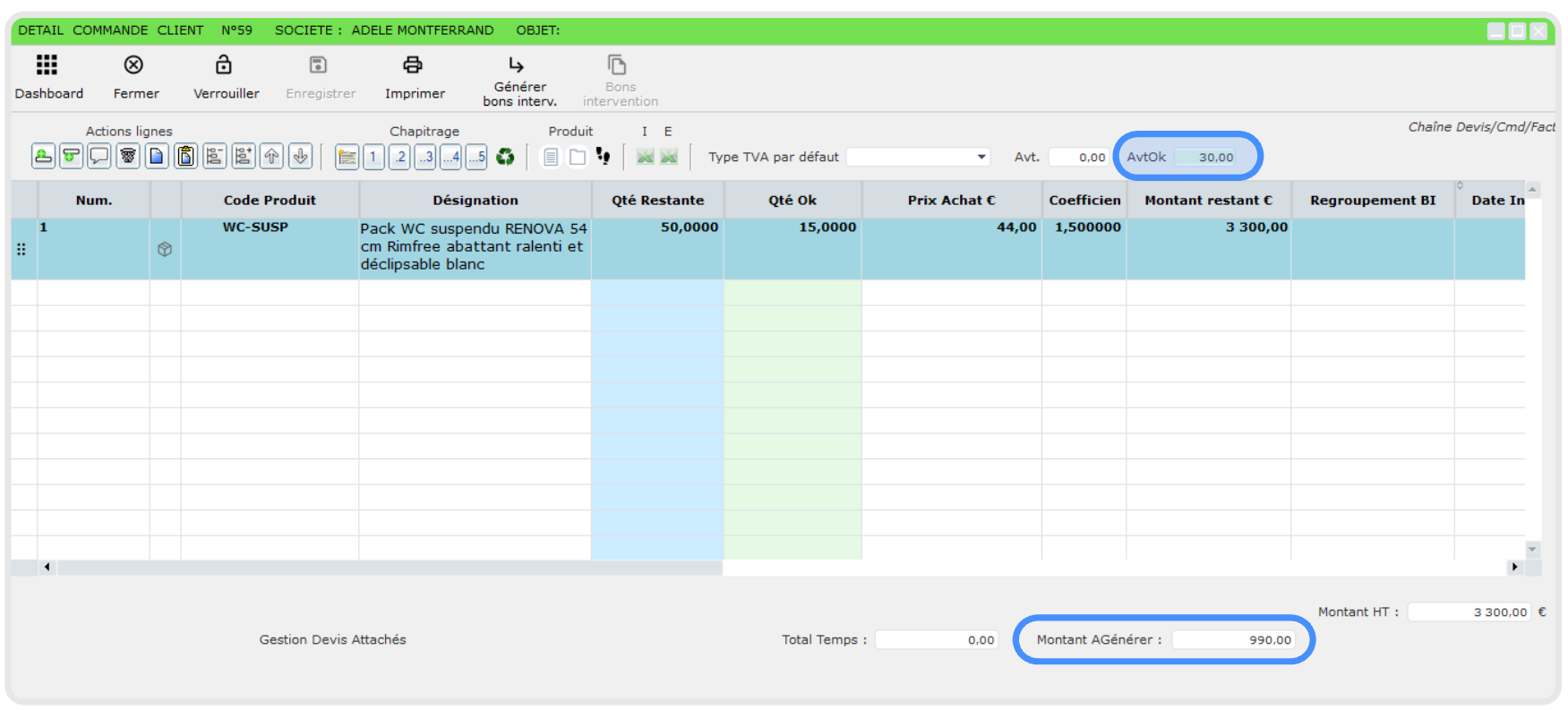 Le paramètre de génération par avancement est à cocher dès le devis et ne peut plus se faire au niveau de la commande.