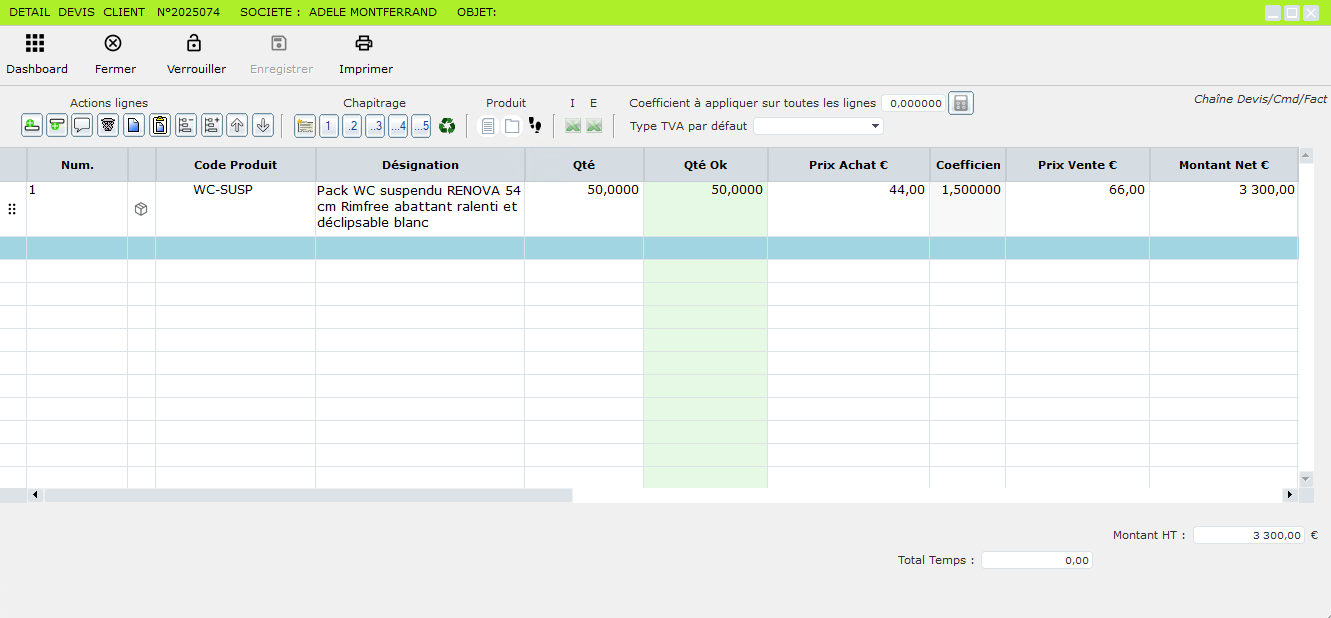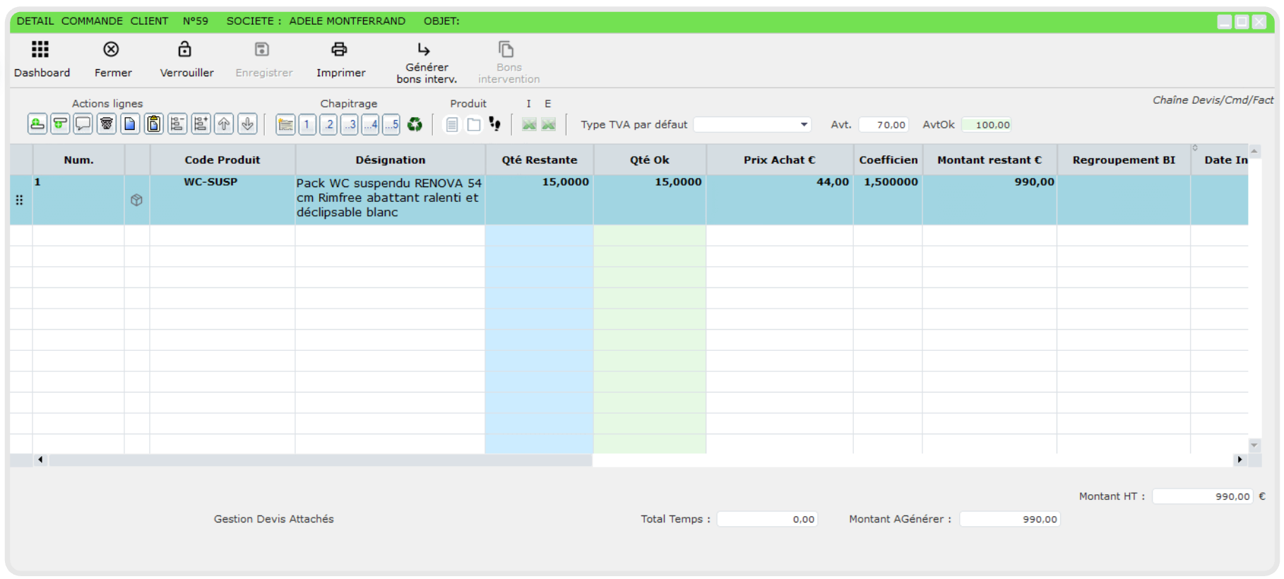 Dans le fiche commande, cliquer sur Lignes pour accéder aux lignes commerciales ;