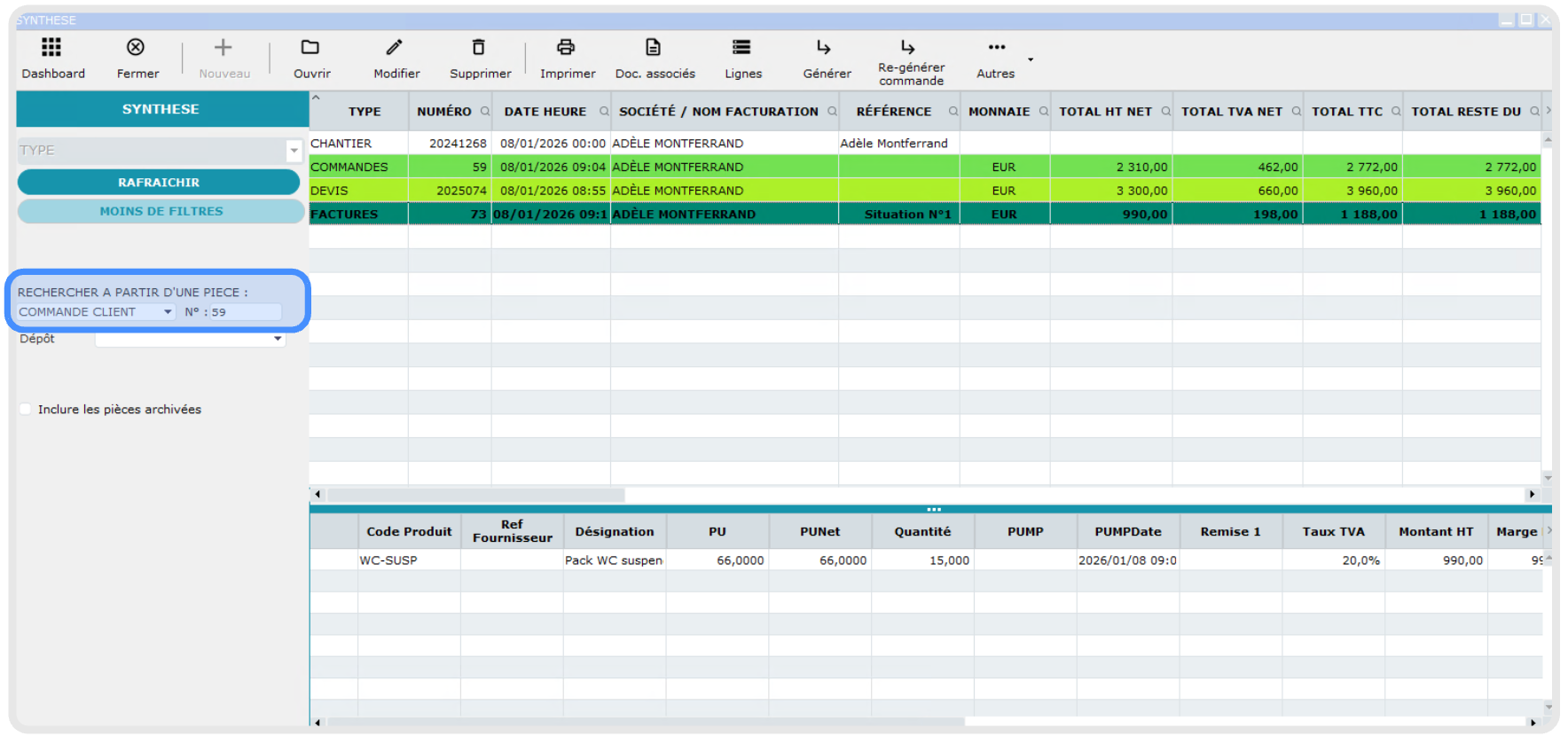 Pour retrouver la commande, le chantier et les factures de situation déjà émises au même endroit, on se rend dans le module SYNTHESE et on sélectionne une des pièces commerciales liées à la commande, ici il s'agit de la commande numéro 59. La synthèse affiche donc le chantier concerné, le devis, la commande, et la première facture de situation créée depuis la commande.