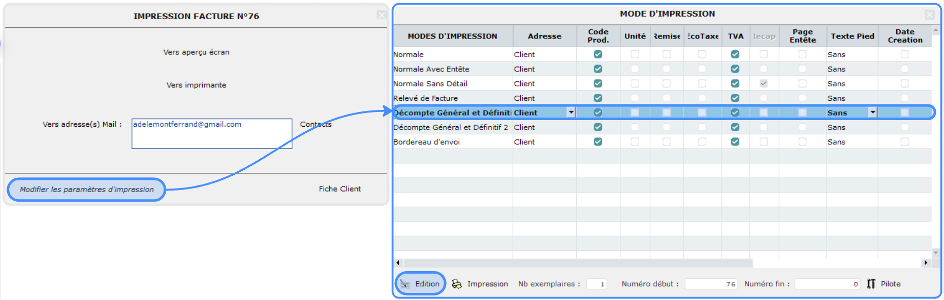 Dans la fenêtre d'impression, nous cliquons sur Modifier les paramètres d'impression pour aller sélectionner le modèle d'impression propre au DGD. Une fois le modèle sélectionné, nous cliquons sur Edition.