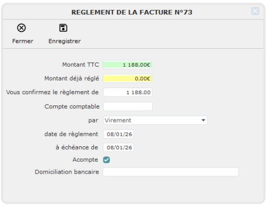 Pour saisir le paiement des factures, on se rend sur la facture concernée, depuis le module SYNTHESE ou depuis la liste des factures et on clique sur Règlement ou Règlement auto pour saisir le règlement de la facture. Ici nous saisissons un règlement auto depuis la liste des factures.