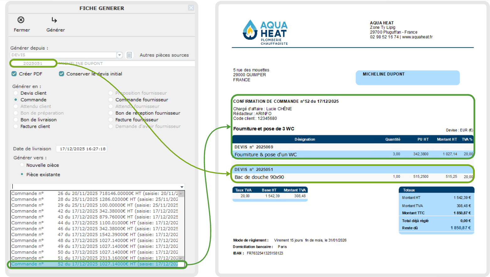 Sélectionner la commande existante vers laquelle générer le devis ;