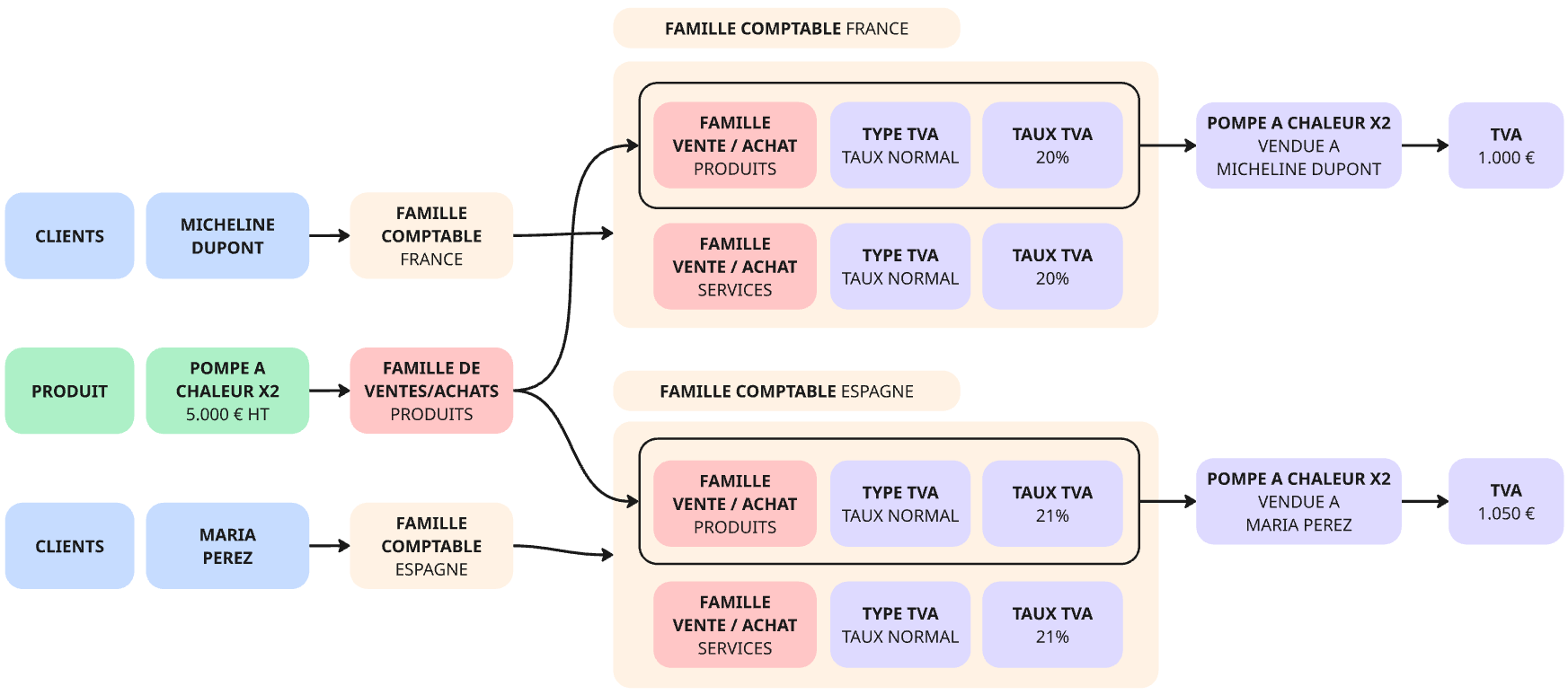 Les comptes comptables permettent de réaliser un transfert en comptabilité. Ils sont attribués, au sein de chaque famille comptable, à chaque taux de TVA dans la famille de vente/achat.