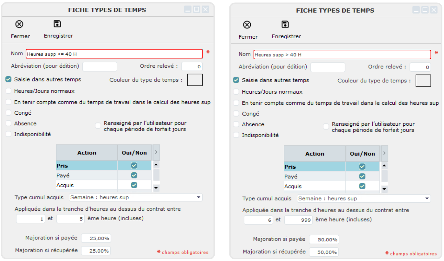 Exemple : pour un contrat de 35 h, si le type de temps concerne la 1ère à la 5ème heure au-delà de 35 heures, saisir 1 et 5.
