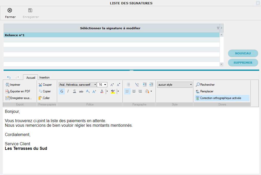 Par exemple, nous nommerons ici la signature "Relance n°1"