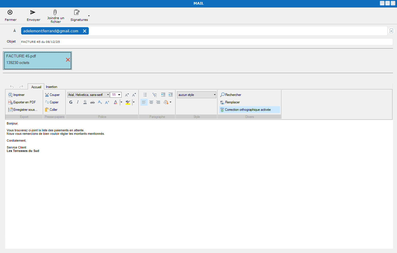 Le corps du mail est automatiquement complété par le contenu de la signature