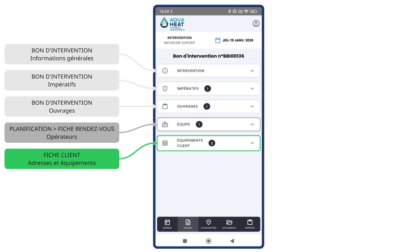 Les sections du bon d'intervention (intervention, impératifs, équipe, etc.) ne s'affichent que si elles contiennent au moins un élément. Les informations contenues chaque section sont héritées des fiches et champs paramétrés dans ATOOK Bureau.