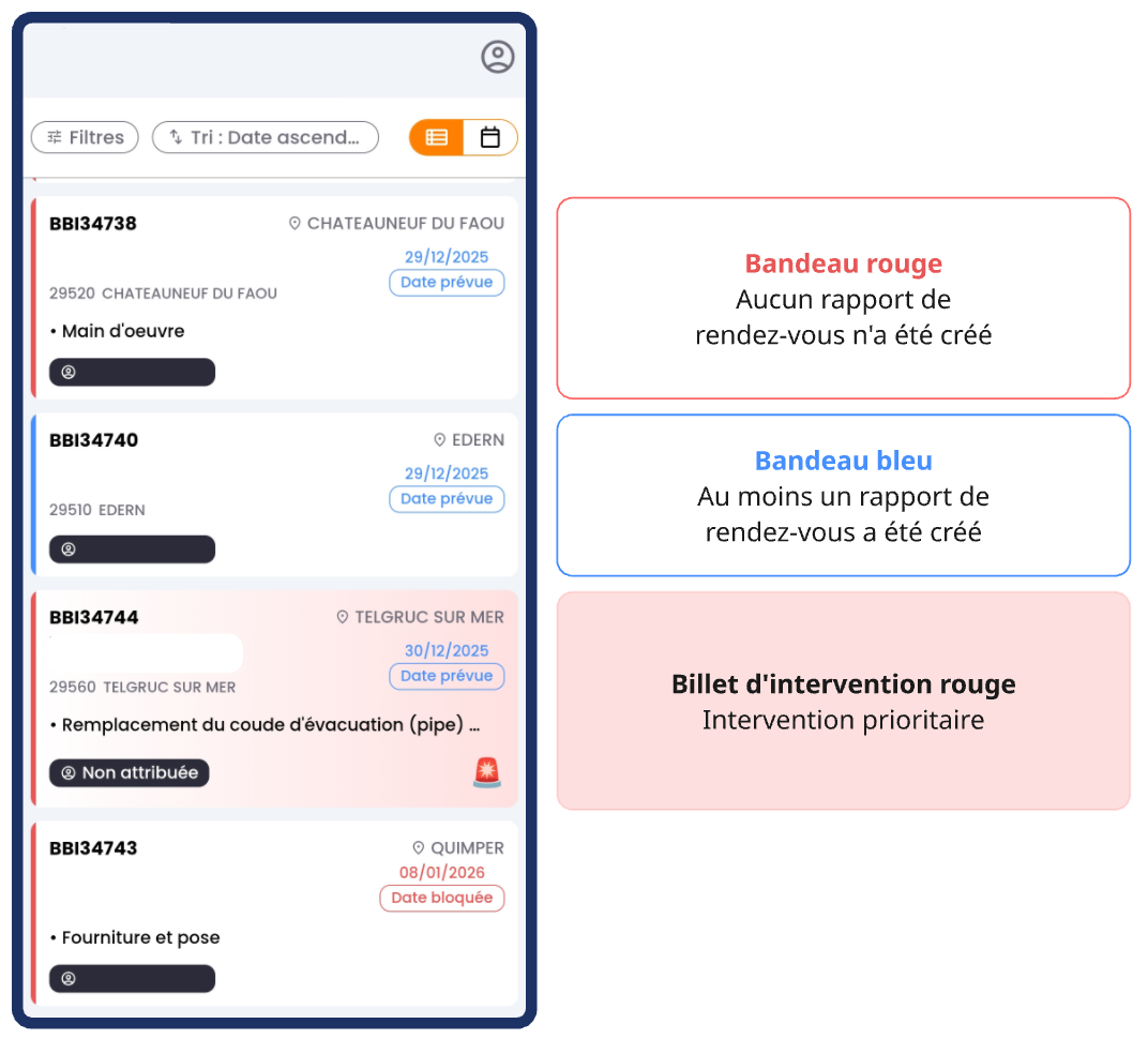: l'intervention est à réaliser en priorité ;Date prévue (en bleu) : la date d'intervention est flexible ;