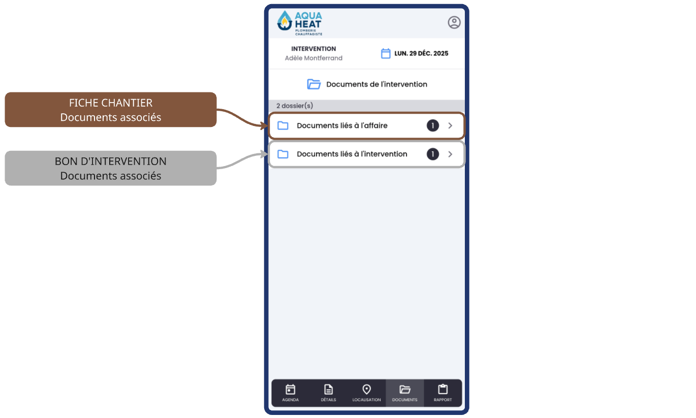 L'application ATOOK Mobilité Chantier permet de consulter à la fois les documents associés au chantier (ou affaire) et les documents associés au bon d'intervention.